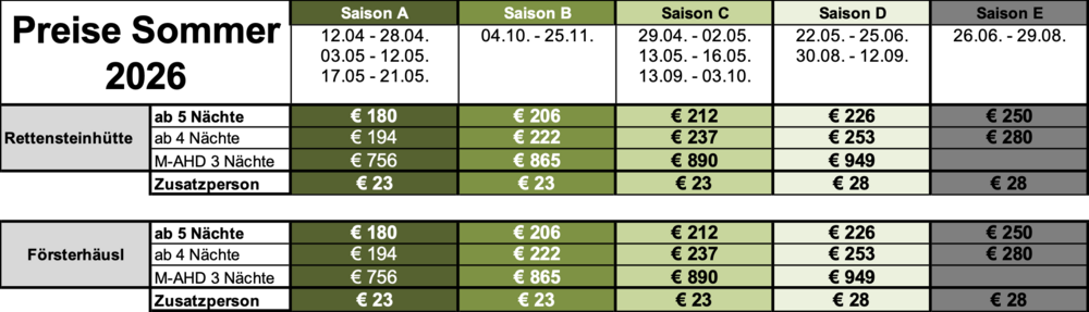 Für jede weitere Person bis zu maximal 12 Personen (Försterhäusl - bis zu 5 Schlafzimmer) bzw. maximal 7 Personen (Rettensteinhütte - bis zu 3 Schlafzimmer) kommt eine einmalige Urlaubspauschale hinzu.